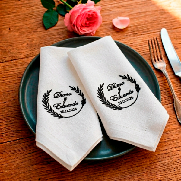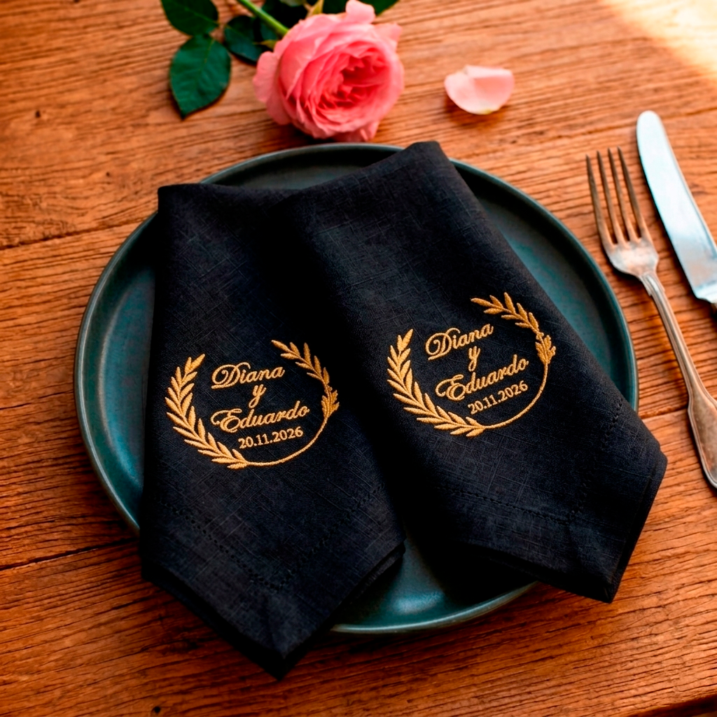 Cada pieza puede personalizarse con el nombre de los novios, una fecha especial o un mensaje de agradecimiento, ya sea para obsequiar a los invitados o como un detalle para la nueva familia. Confeccionadas en lino de alta calidad, con dobladillo ancho y bordado delicado, combinan elegancia, textura y durabilidad — pensadas para conservarse y recordarse con el paso del tiempo.