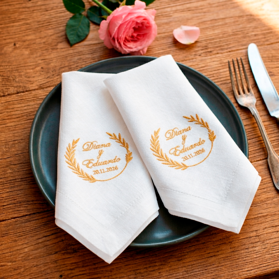 Cada pieza puede personalizarse con el nombre de los novios, una fecha especial o un mensaje de agradecimiento, ya sea para obsequiar a los invitados o como un detalle para la nueva familia. Confeccionadas en lino de alta calidad, con dobladillo ancho y bordado delicado, combinan elegancia, textura y durabilidad — pensadas para conservarse y recordarse con el paso del tiempo.