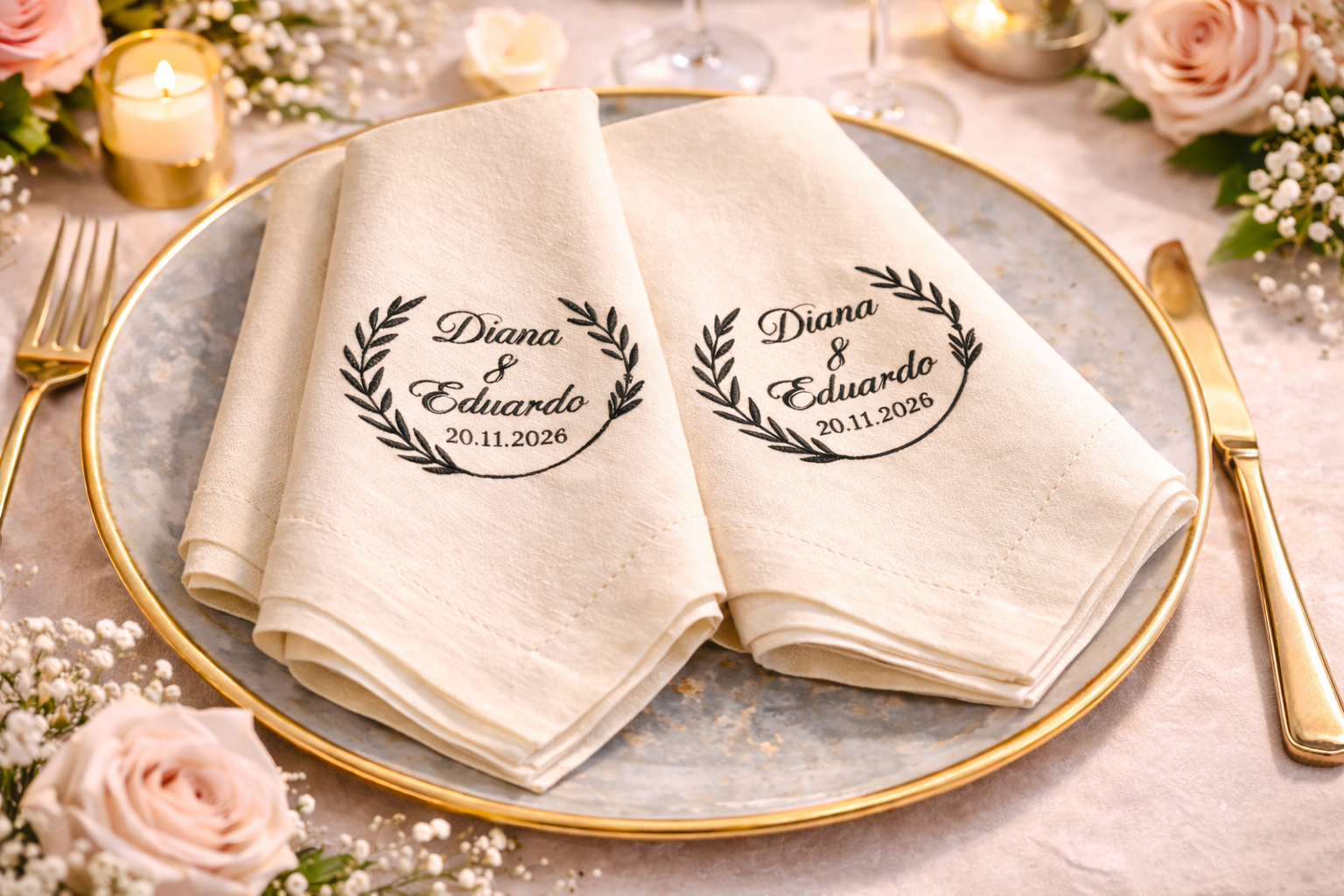 Celebra los momentos que perduran. Nuestras servilletas bordadas están diseñadas para convertirse en un recuerdo único de ese día irrepetible.