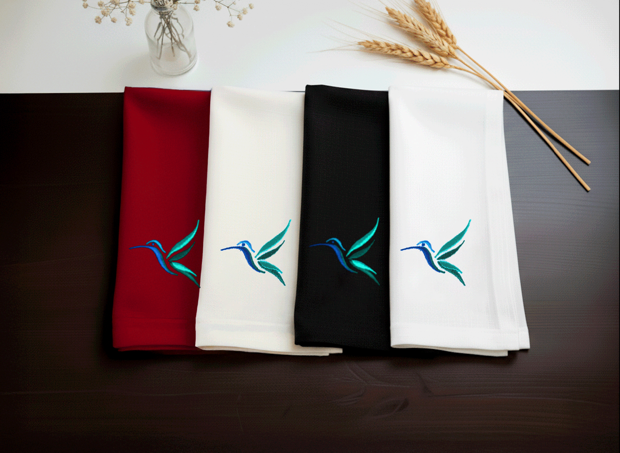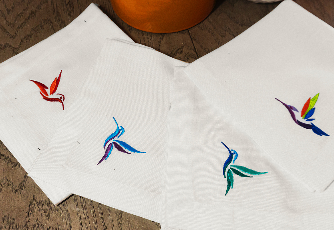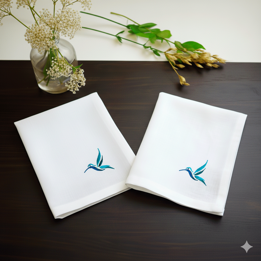 Este set de 4 servilletas presenta el diseño icónico del colibrí verde, bordado con precisión sobre lino algodón de alta calidad. Un detalle lleno de frescura y sofisticación que realza cualquier mesa con un toque vibrante y elegante.