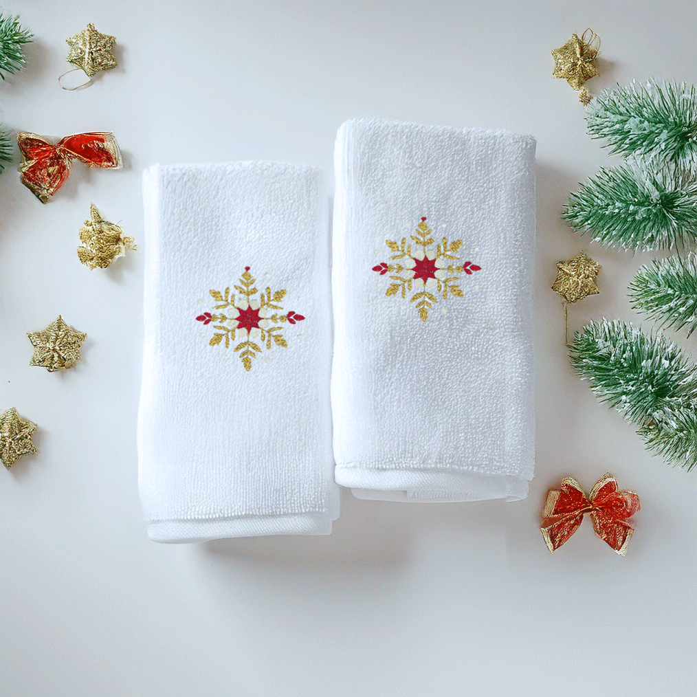 Cada pieza está elaborada con toalla blanca de textura afelpada, bordada con detalle y equilibrio, perfecta para dar un toque festivo a tu hogar o para regalar con distinción.