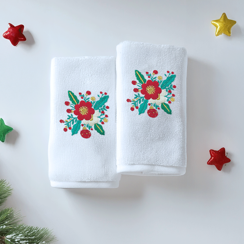 Cada pieza está elaborada con toalla blanca de textura suave y bordado de alta precisión, ideal para regalar o dar un toque festivo a tu hogar.